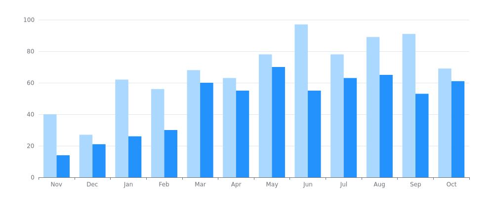 The data shows the number of properties sold or listed per month over a 12-month period. The number of properties sold or listed ranged from 27 to 97 per month, with the highest number in June 2023. The data also shows that the number of properties sold or listed increased steadily from November 2022 to May 2023 before slightly decreasing in the following months.