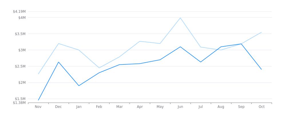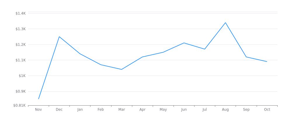 The median sale price per square foot shows a steady increase from $847.899 in November 2022 to $1343.309 in August 2023, with a peak of $1211.997 in June 2023. However, the trend seems to reverse in the last two months with a slight decrease to $1118.812 in September and $1087.138 in October 2023.