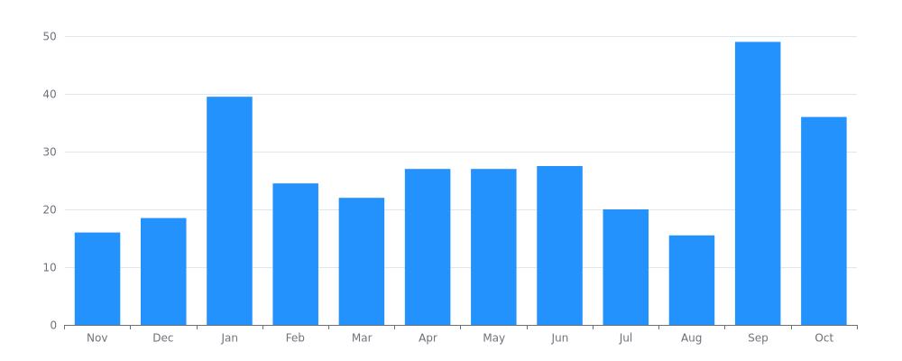 The median days on market for properties in this dataset fluctuated throughout the year, with a low of 15.5 days in August and a high of 49 days in September. The median days on market was relatively consistent from April to July, hovering around 27 days. However, January had significantly higher median days on market, with a value of 39.5 days.