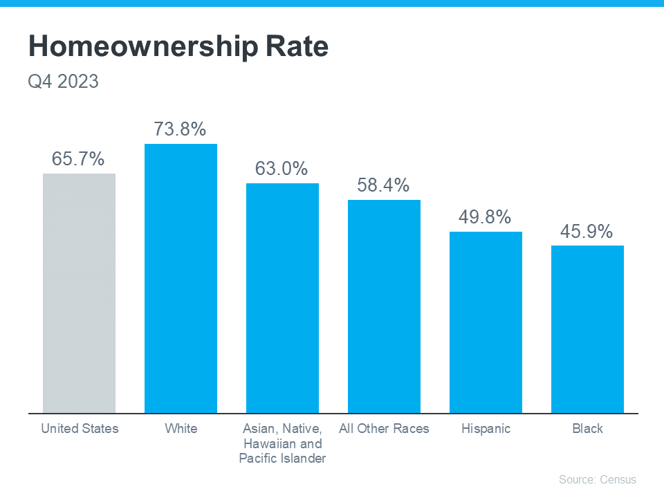 It's clear that achieving homeownership is more challenging for certain groups because there’s still a measurable gap between the overall average U.S. homeownership rate and that of non-white groups. Today, Black households continue to have the lowest homeownership rate nationally (see graph below):