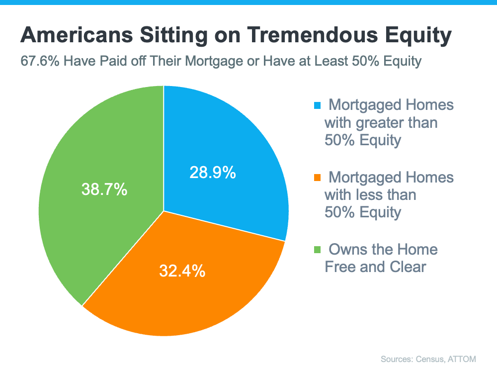 Second, Americans are sitting on tremendous equity right now. According to the Census and ATTOM, roughly two-thirds (around 68%) of homeowners have either paid off their mortgage or have at least 50% equity (see chart below):