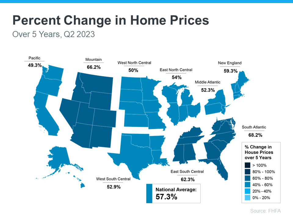 The map below uses data from the Federal Housing Finance Agency (FHFA) to show just how noteworthy price gains have been over the last five years. And, since home prices vary by area, the map is broken out regionally to help convey larger market trends: